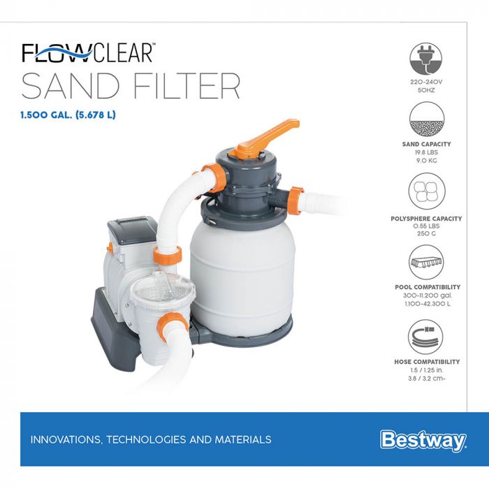 A Bestway homokszűrős vízforgatói segítenek a medence karbantartásában, hogy azokat hosszú ideig használhassuk. A Bestway vízforgatói könnyű és kényelmes megoldást kínálnak a medencevíz tisztán tartására. Használatukkal távol tarthatjuk a medencéből a koszt, homokot és egyéb szennyeződéseket. A papírszűrős vízforgatókkal ellentétben a homokszűrős vízforgató karbantartása egyszerűbb, a homokot elegendő 2-3 évente lecserélni.