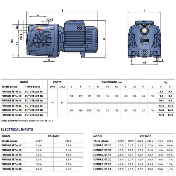 A Pedrollo Future JET önfelszívó kerti szivattyú maximum 9 méter mélységből képes akár a magas levegőtartalmú (gázos) víz szivattyúzására is. 1” -os belső menetes szívó-és nyomóoldali csatlakozással rendelkezik, ahogy azt már a klasszikus Pedrollo JET szériánál megszokhattuk.
